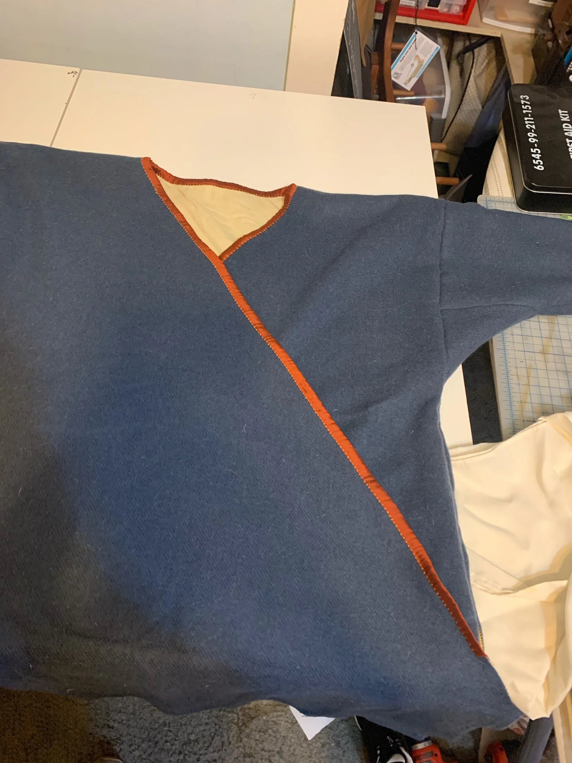 It looks great. Putting burnt orange on a blue coat lined with pale yellow was a good call. I need to do the bottom and cuff hems still, but now that I have the front edges done, the rest is not so daunting.