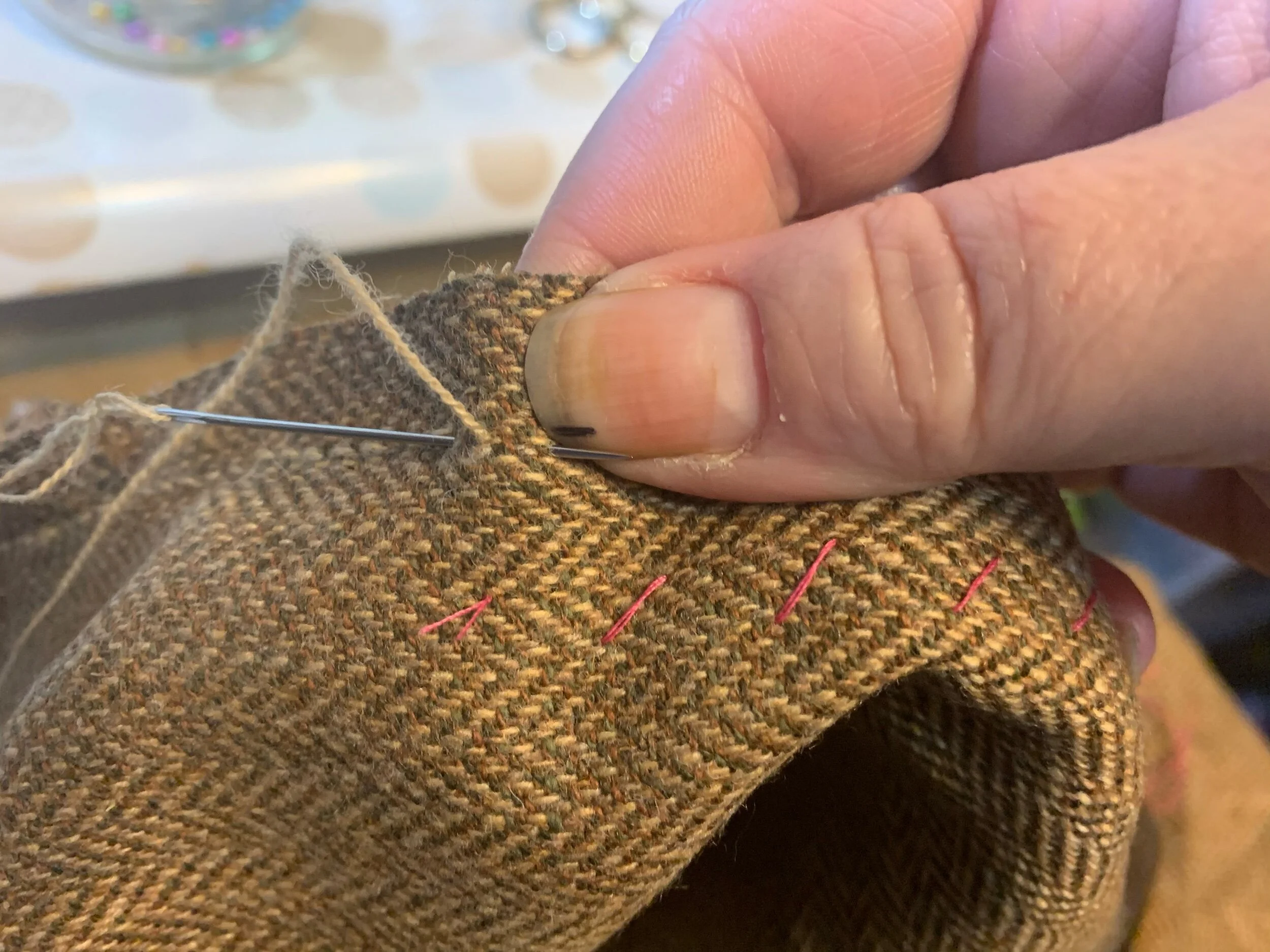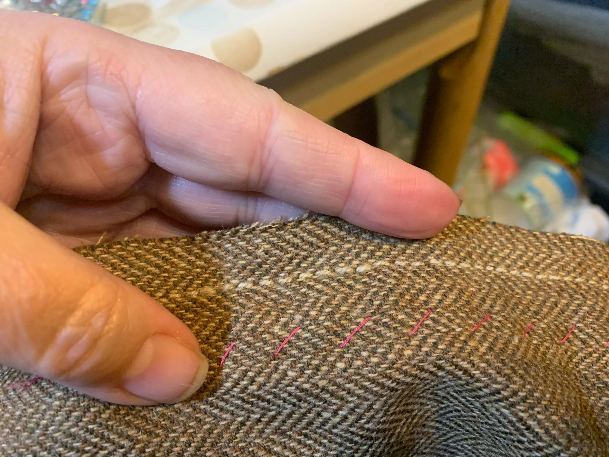 The first leg is almost sewn on. I switched thread from the Manx fiber to a skein of BFL that I tried to dye with buckthorn and only succeeded in turning it a very pretty golden beige. It actually looks great on the herringbone.