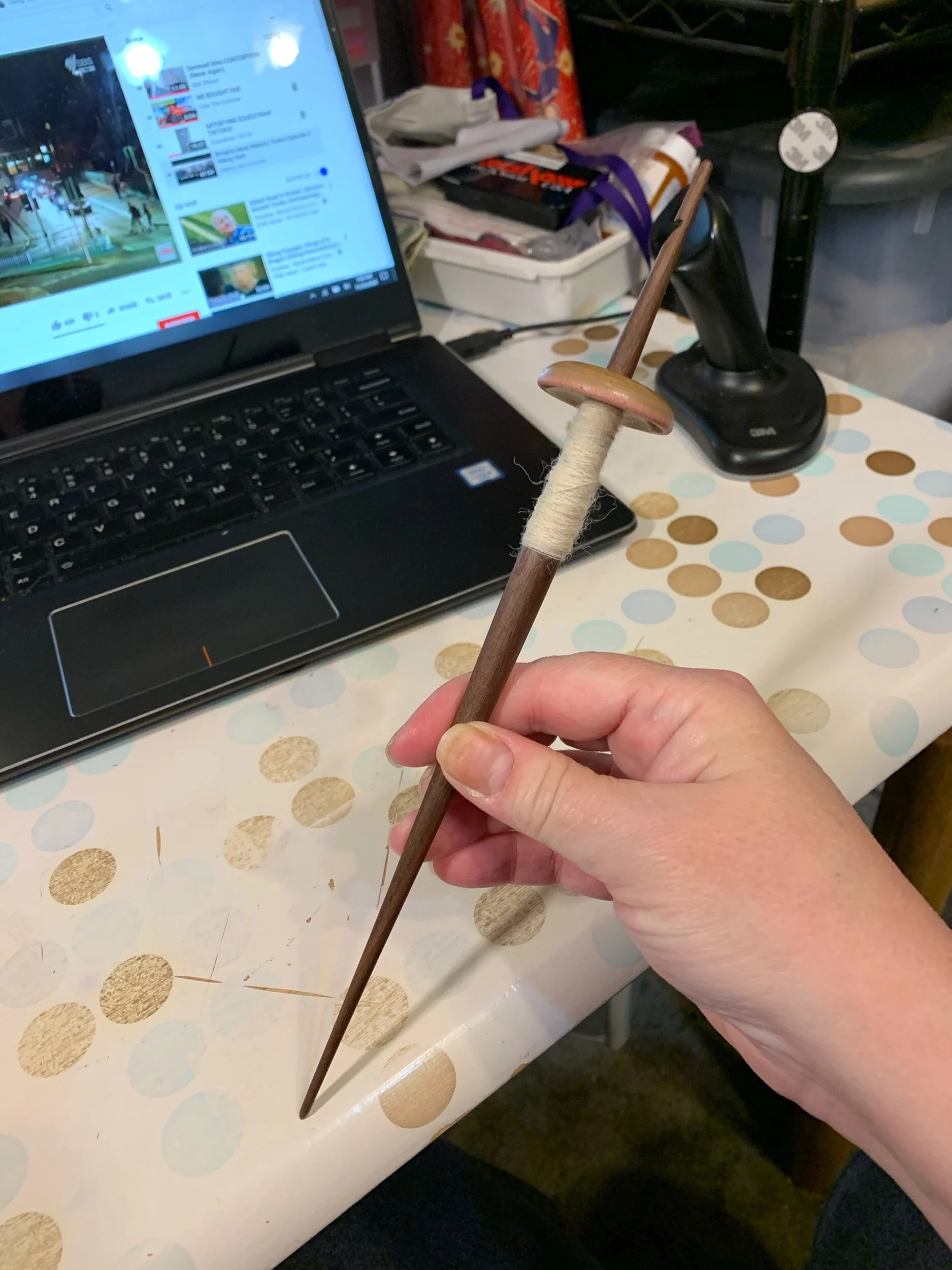The whorl was given to me as a token at Artifacts of a Life (I regret that I don't remember who gave it to me), and it's been waiting for a shaft since February. It only weighs 10 grams, or 0.4 ounces, so it's quite light.The shaft is around 5 grams, or 0.2 ounces, so still pretty light. As such, it does get a bit wobbly at first, and then as you get more singles on it, it spins more and more smoothly.