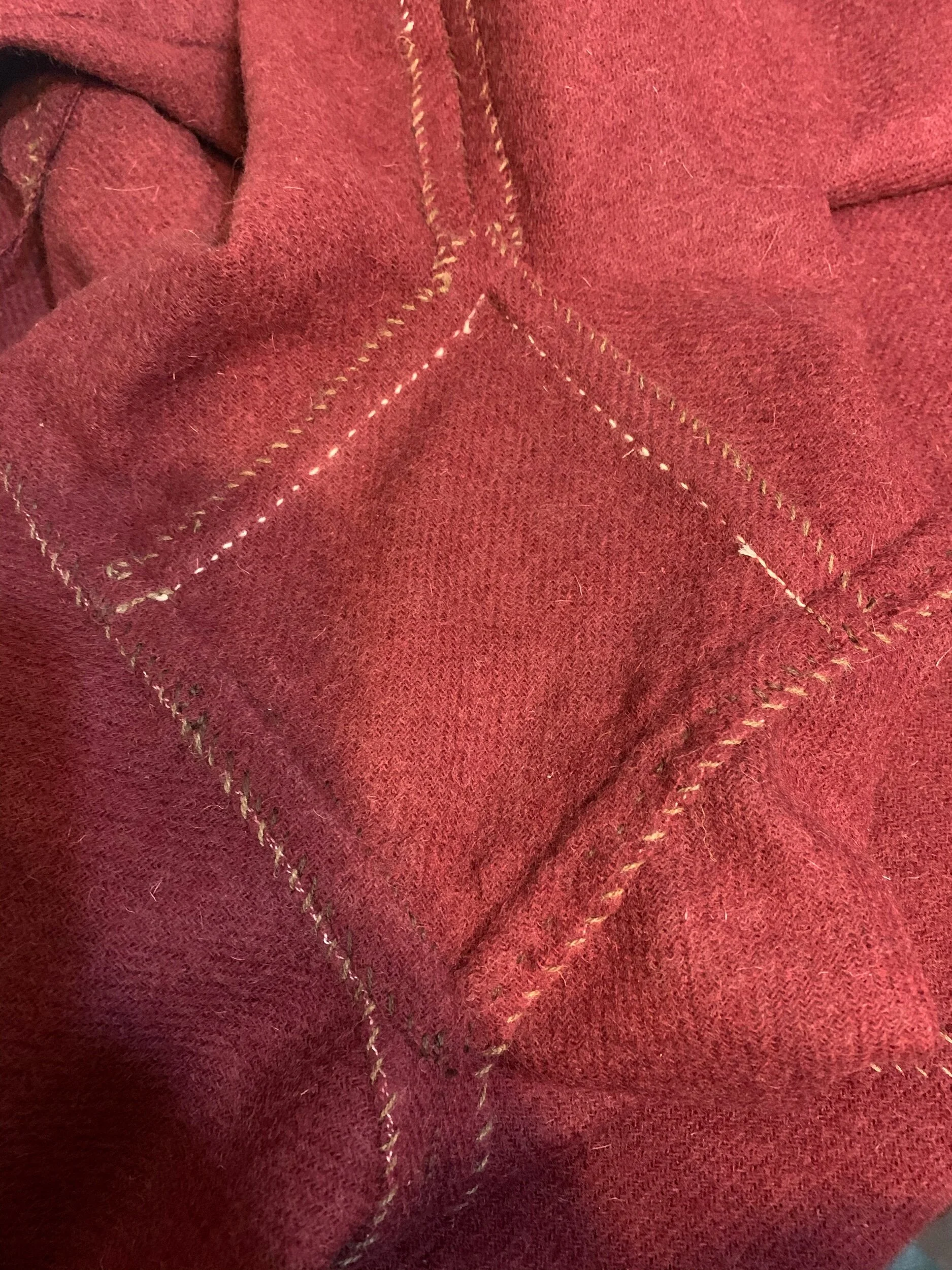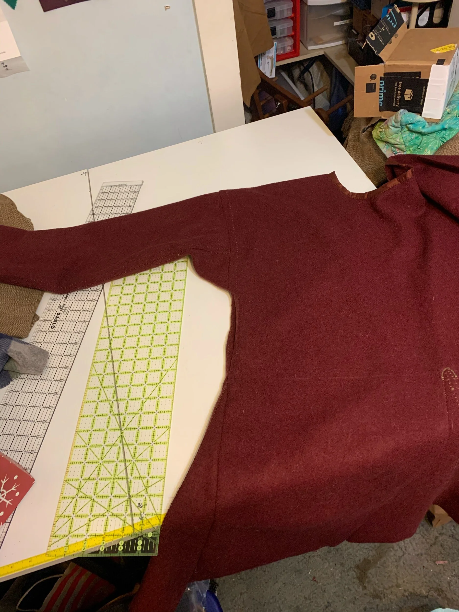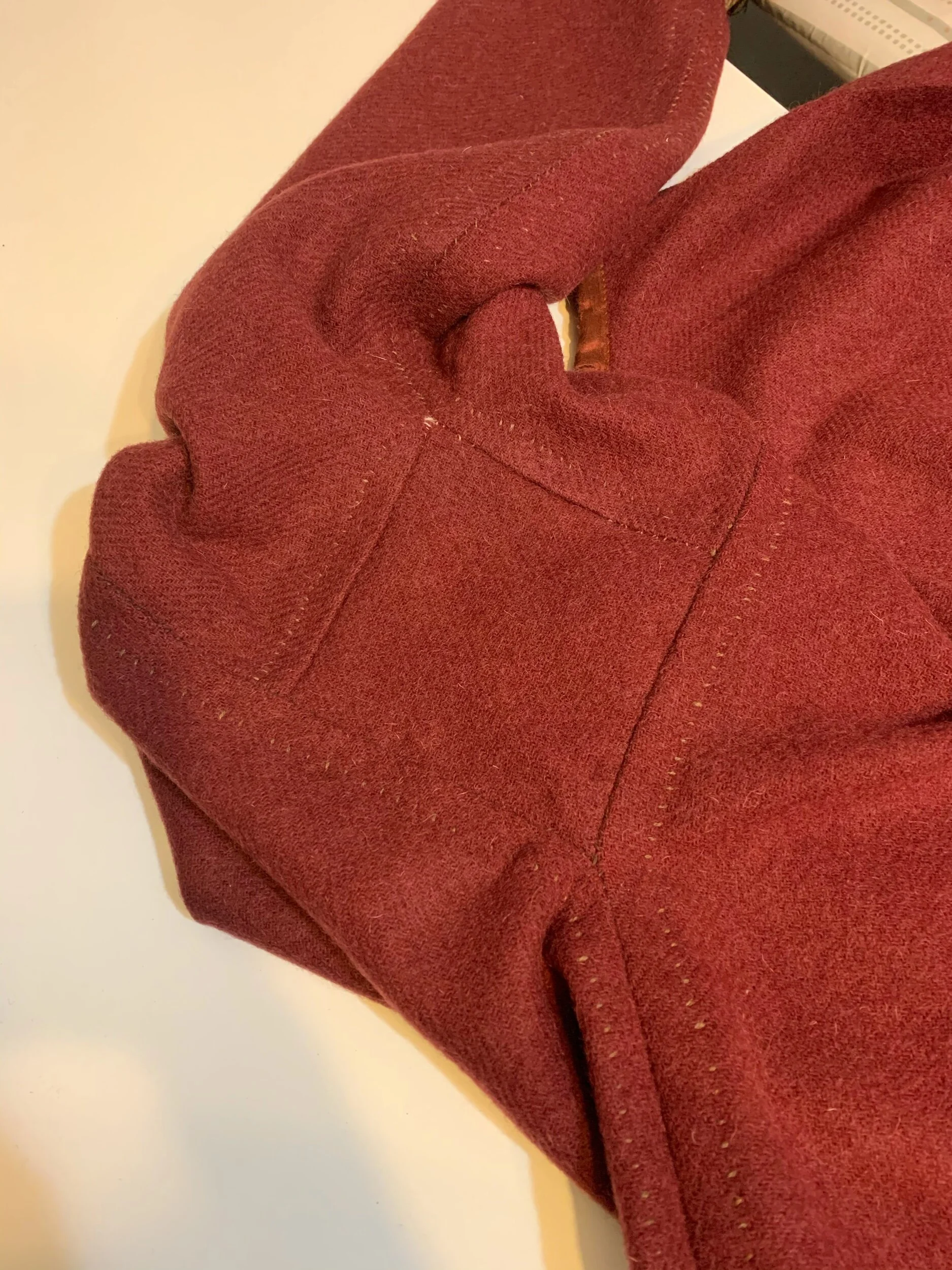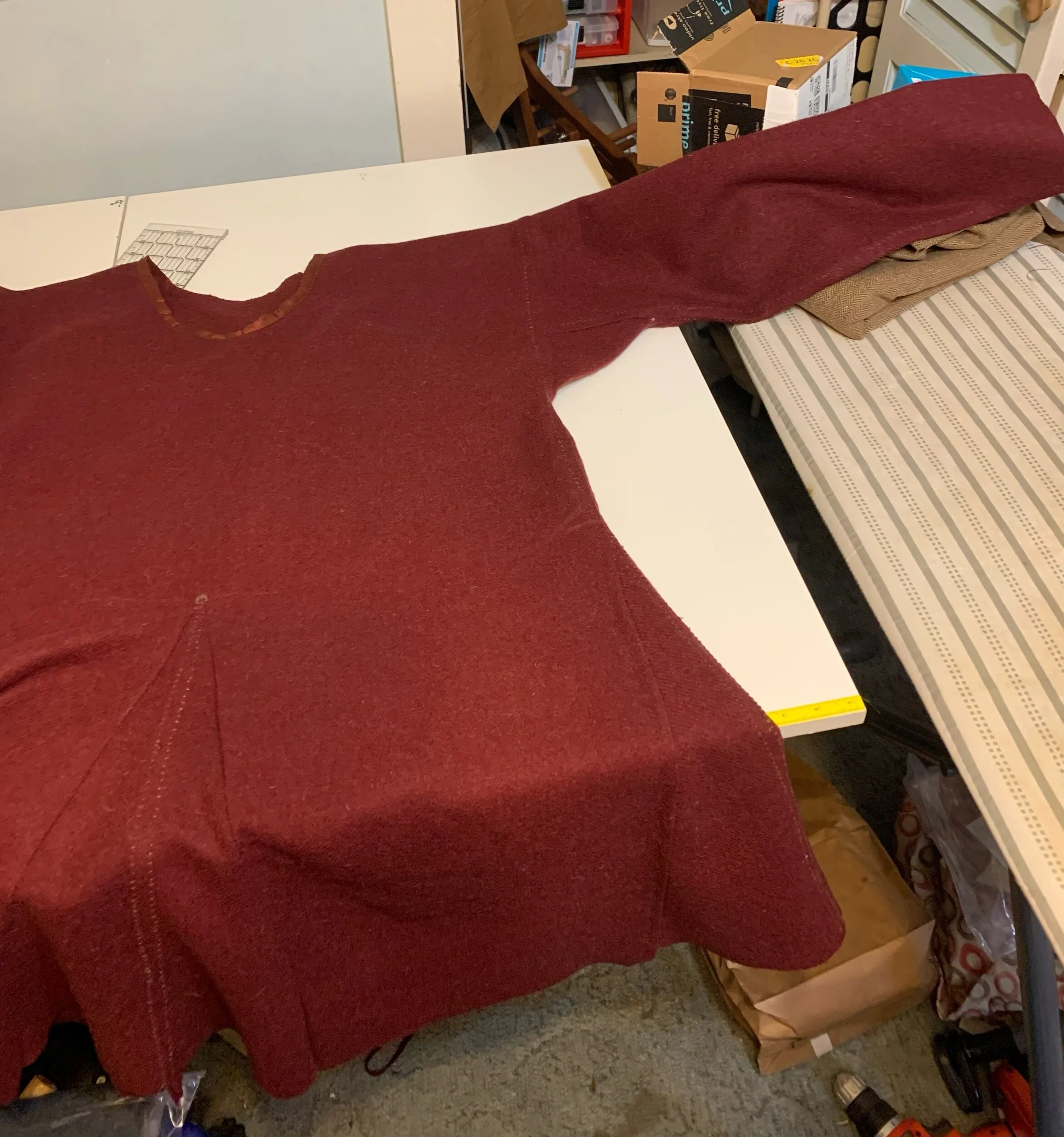 The right side of the tunic is finished. I sewed in the sleeve, spread the seam allowance over the folded seam allowance of the body panel and stitched that down, closed the side seam, then opened the seam allowance of the gore over the body panels and felled that down. Finishing the seams that way recesses the gore and sleeve “behind” the body panel, and the gusset already looks like that.
