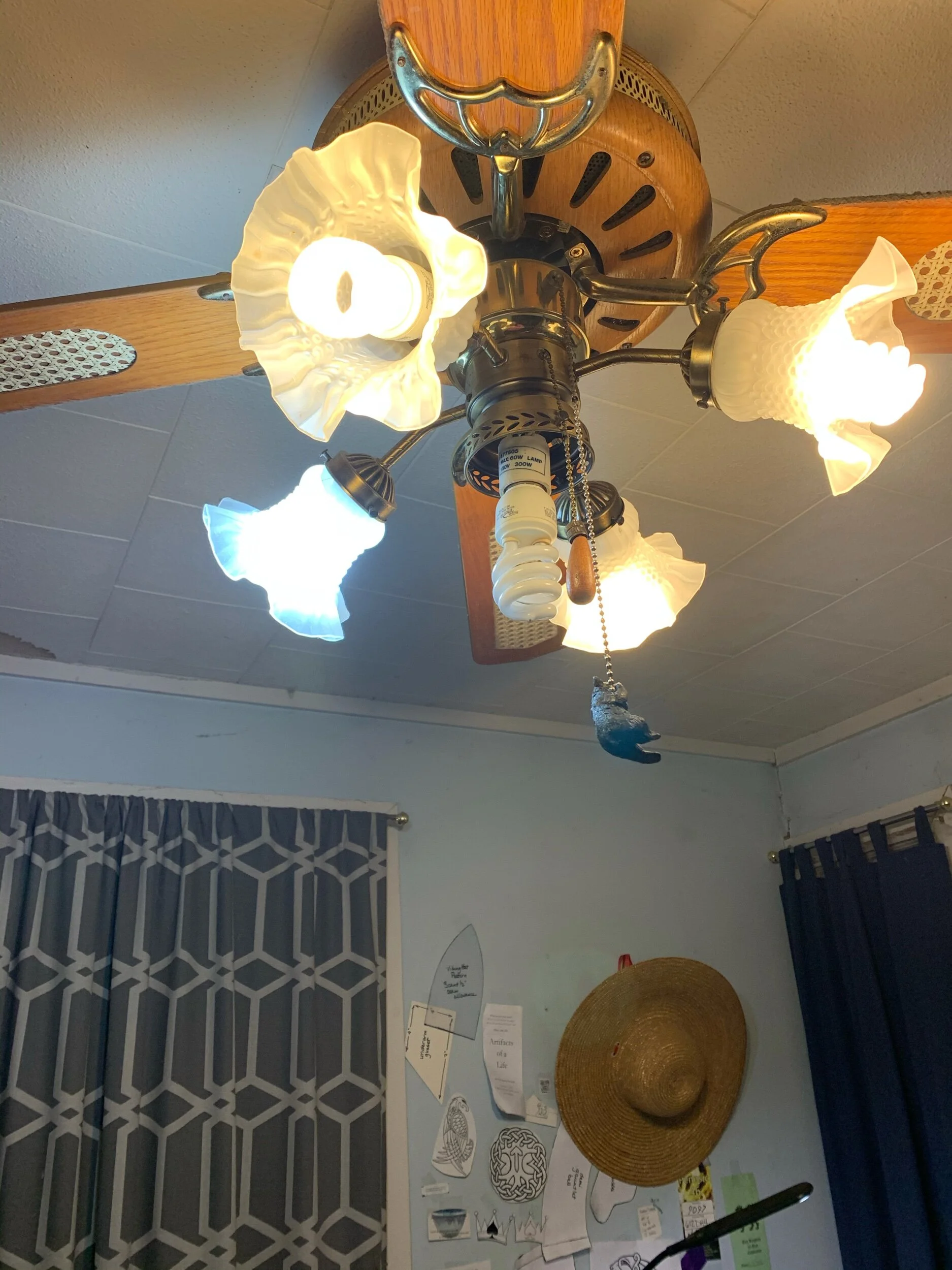 So I got the pattern made. I was getting the fabric out to lay out the pieces, and I needed to move the extensive collection of rulers that I used to draw nice lines on the pattern pieces when I discovered exactly how close the center globe of my ceiling fan is to the floor.