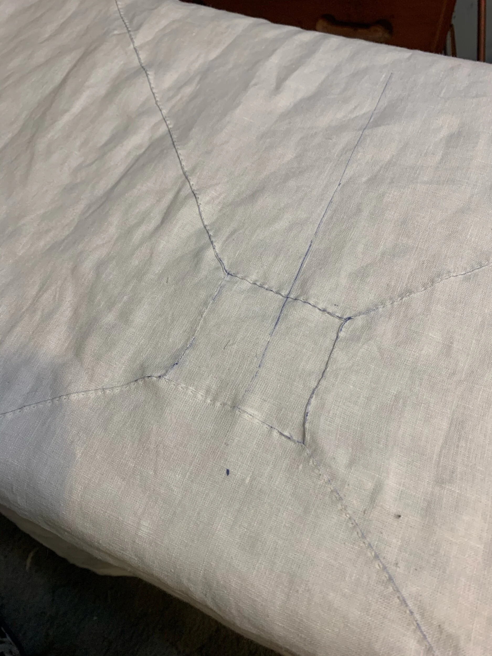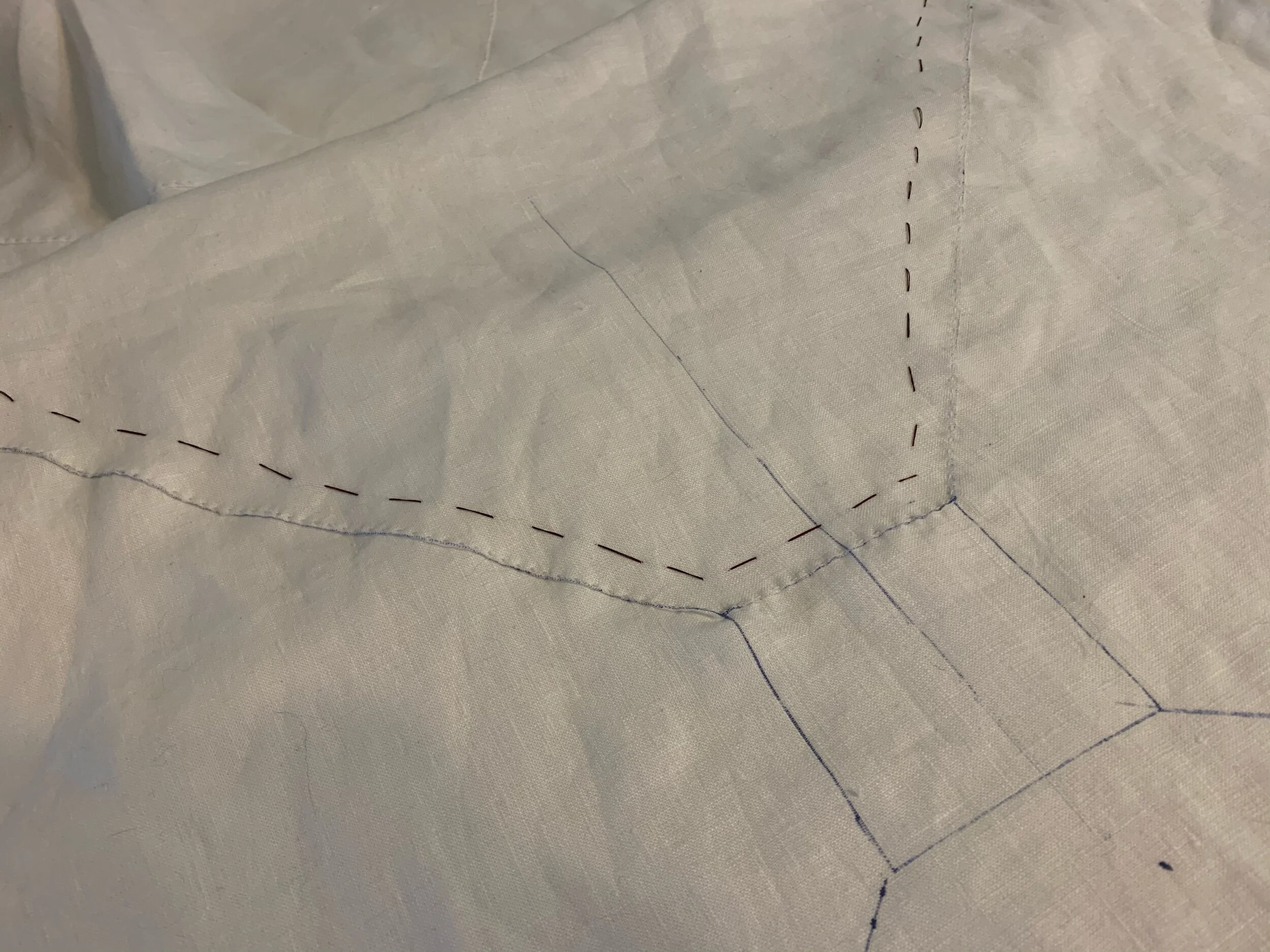 First upper arm complete. On to the next. This goes so much faster without the pins. I think that on the lower part I’ll be basting closer to the stitch line, though.
