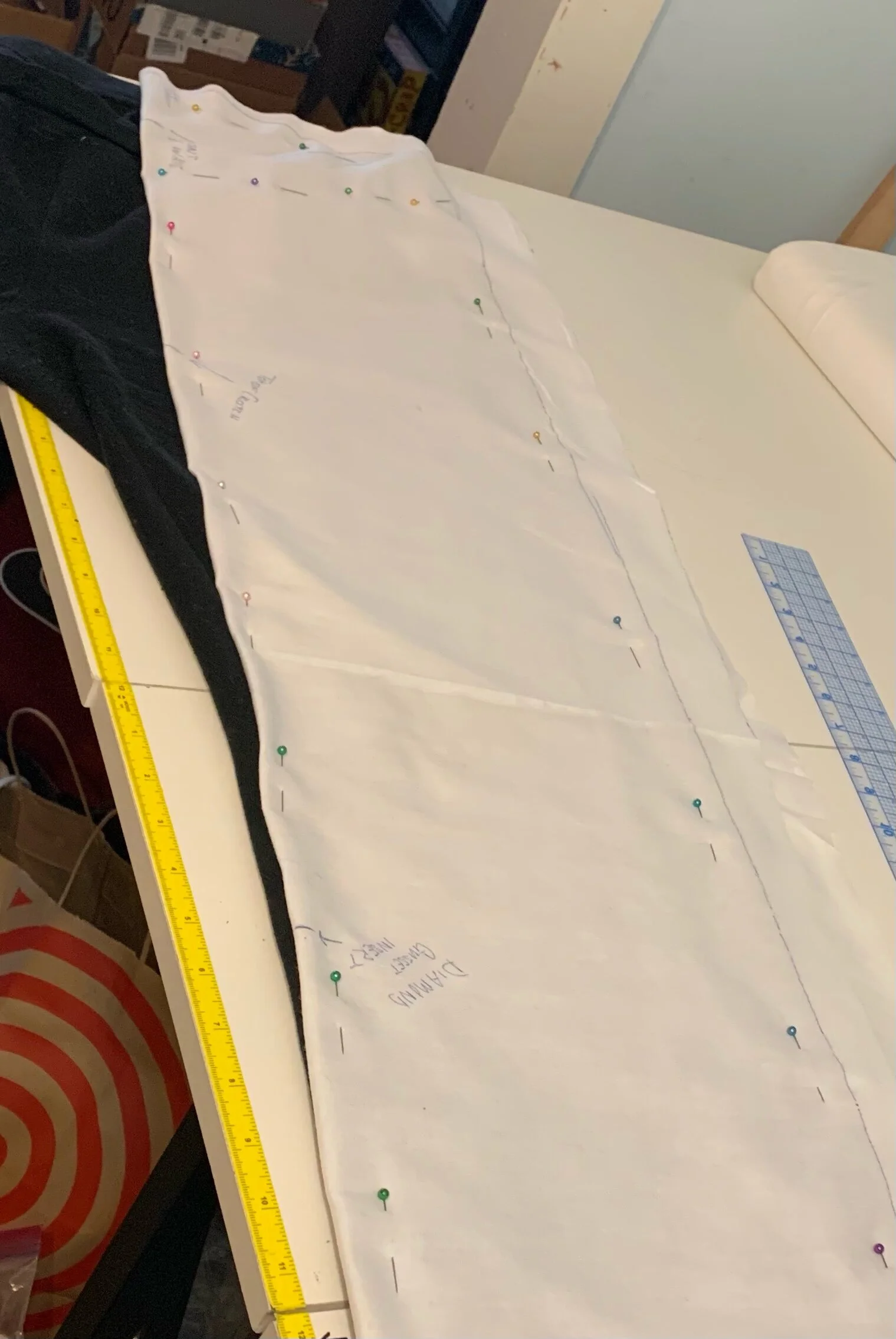 To that end, I’m trying to make a second leg so I can figure out the crotch. I got to whip out my seam allowance rulers to create a margin for trimming down the pieces of muslin, and I’m just about done with the second leg. Which is good, because I’m also just about ready for bed.