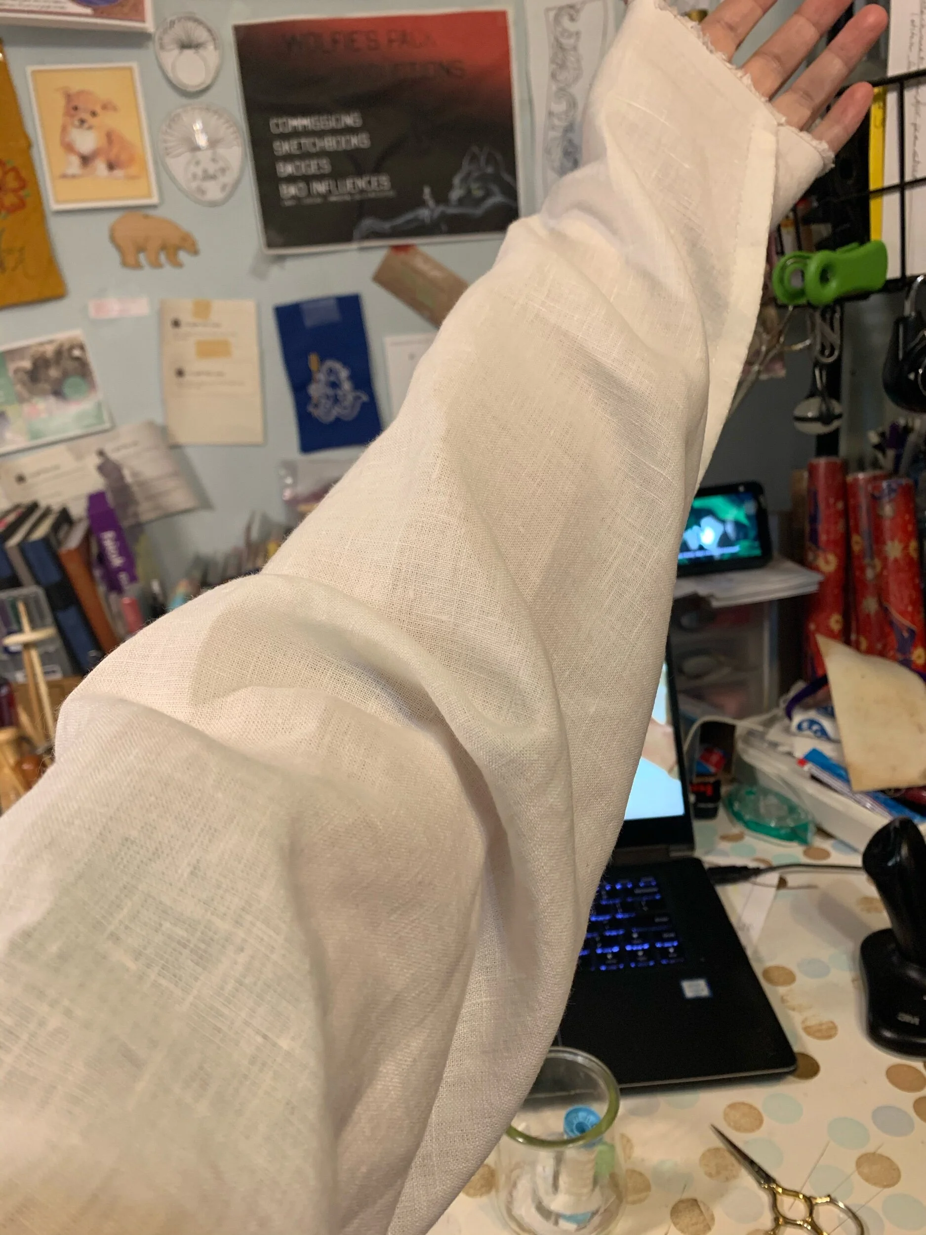 But it’s DONE. It was easier than the last one, but I ended up pulling stitches and resewing at least once because I forgot to cut the taper from elbow to wrist before I started sewing the underarm seam. Easy enough to fix, but Faces Were Made.